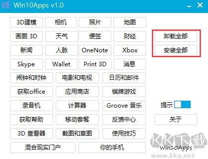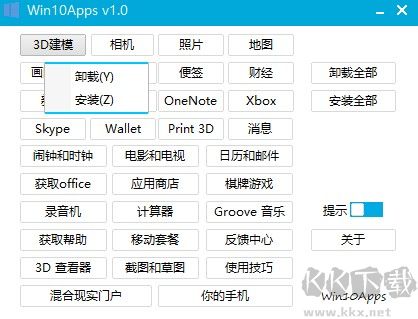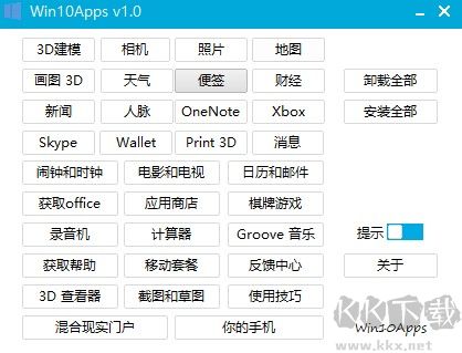 Win10Apps(卸載工具)是一款適用于Windows10系統(tǒng)的應(yīng)用卸載工具,可快速卸載系統(tǒng)自帶的3D建模、相機(jī)、照片、地圖、畫圖 3D、天氣、便簽、財(cái)經(jīng)等不常用軟件,而且不會(huì)影響系統(tǒng)穩(wěn)定性。用戶后續(xù)想重新使用這些軟件,也能通過它重新安裝。主界面會(huì)顯示所有支持卸載與安裝的Windows10預(yù)裝程序(如相機(jī)、人脈等),可以借助它對(duì)系統(tǒng)自帶應(yīng)用實(shí)現(xiàn)一鍵卸載和恢復(fù),輕松完成自帶應(yīng)用的卸載與重裝操作。軟件體積小巧、簡(jiǎn)單易用,只需點(diǎn)擊幾個(gè)按鈕就能正常使用。