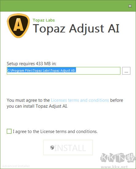 2、雙擊Topaz Adjust AI.exe,選擇目錄,同意條款,點擊install安裝