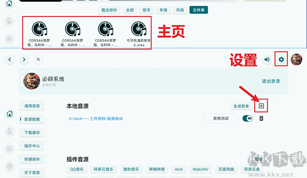 2、在右上角的設置里,打開音源數(shù)據(jù),你可以通過旁邊的“+”圖標添加本地音樂文件,添加完后,主頁里就會顯示本地音樂了。