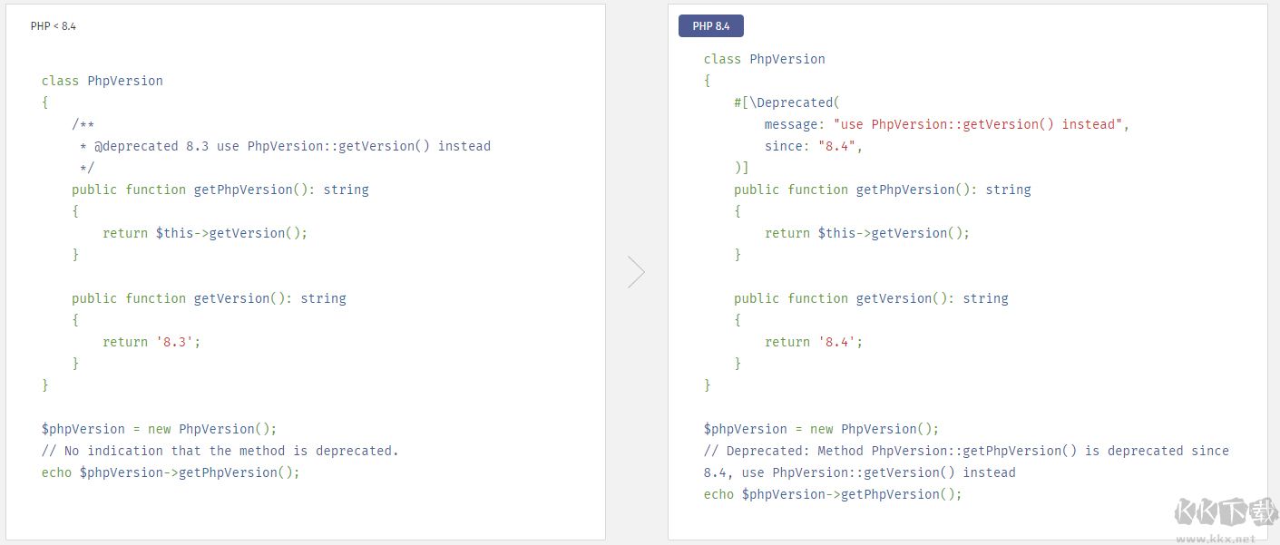 3、全新的 #[\Deprecated] 屬性,讓 PHP 現(xiàn)有的棄用機制可以應用在用戶自己定義的函數(shù)、方法以及類常量上。