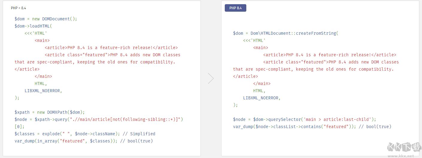 5、新的 DOM API 可在 Dom 命名空間中調(diào)用,借助這個 API,能通過 Dom\HTMLDocument 和 Dom\XMLDocument 類來創(chuàng)建文檔。