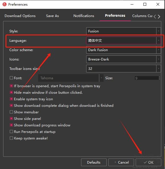 2、在彈出窗口中找到Language,在下拉欄中找到簡體中文并選擇,點擊OK。