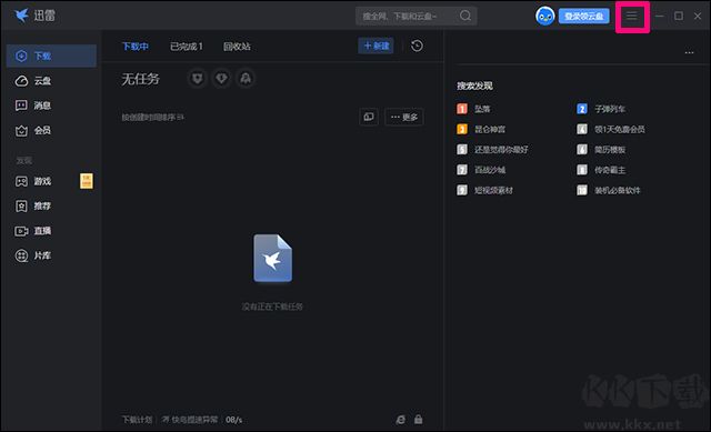 啟動后默認(rèn)進(jìn)入下載管理界面,整體采用三欄式設(shè)計,左側(cè)為功能導(dǎo)航區(qū),中部為主操作區(qū),右側(cè)用于展示相關(guān)信息。