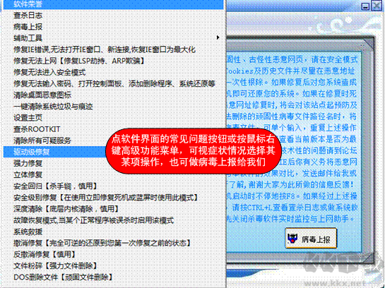 1、查殺QQ尾巴、黑客程序、蠕蟲(chóng)及木馬類(lèi)病毒,同時(shí)支持IE環(huán)境清理與系統(tǒng)性能調(diào)優(yōu)。