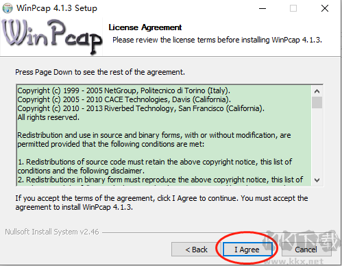 3、進(jìn)入到WinPcap軟件使用協(xié)議界面,我們點(diǎn)擊界面下方的“I agree”選項(xiàng)進(jìn)入下一步。