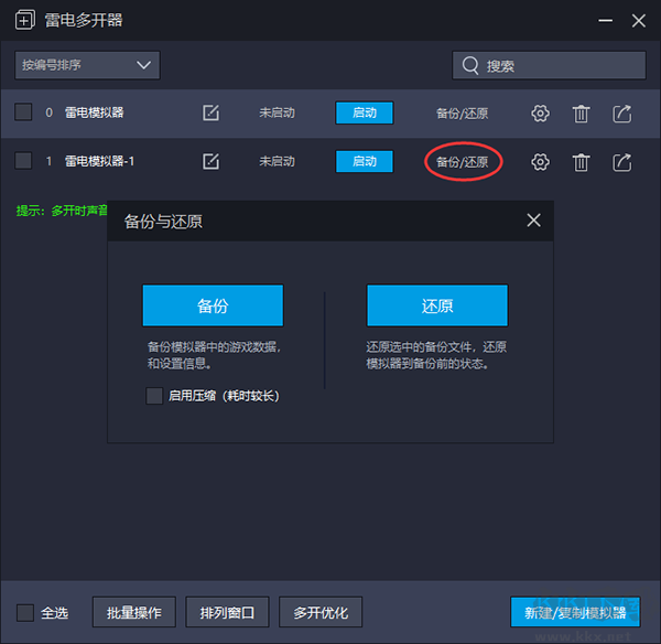 支持對(duì)模擬器進(jìn)行備份與還原操作,運(yùn)行中的模擬器無(wú)法執(zhí)行相關(guān)功能。