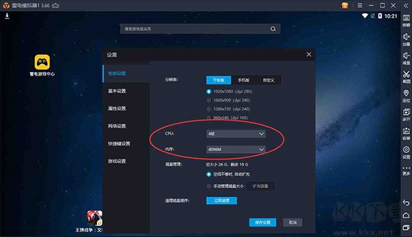 設(shè)置:可調(diào)整CPU、內(nèi)存、分辨率等參數(shù),與模擬器內(nèi)設(shè)置功能一致