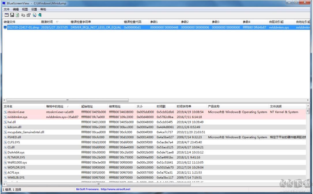 3.BlueScreenView枚舉類型崩潰堆棧中的內(nèi)存地址,并尋找在其中將會(huì)造成 崩潰的驅(qū)動(dòng)器/控制模塊。