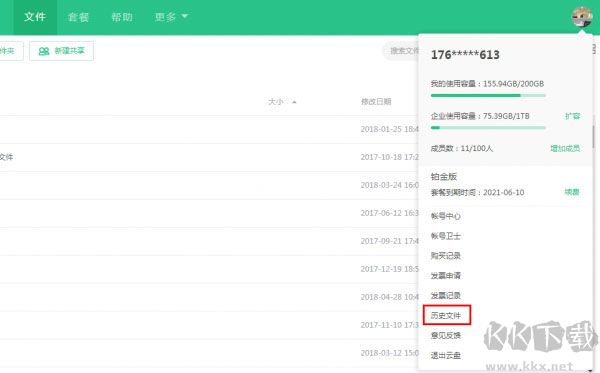 1、打開360安全云盤同步版,點(diǎn)擊右上角頭像,在下拉選項(xiàng)中選擇“歷史文件”;