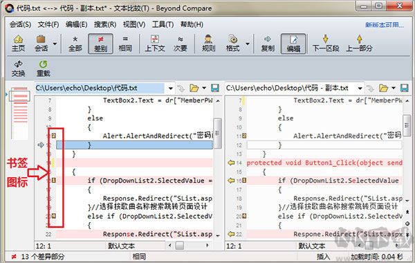 在文本比較左右兩側(cè)窗格中,差異部分以不同顏色標(biāo)注顯示,如果您在修改文本差異部分時(shí),有不確定的或者需要著重標(biāo)注的就可以使用軟件提供的書簽設(shè)置來標(biāo)記行信息。