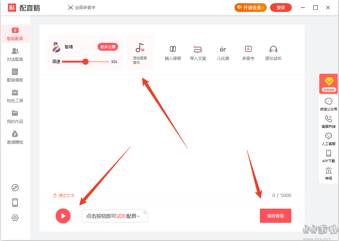 1、主界面設(shè)計(jì)直觀,上方為功能選項(xiàng),可切換主播音色、添加背景音樂等,輸入文字即可生成配音,試聽滿意后可保存;