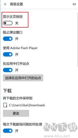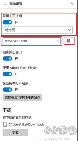 4、在高級設(shè)置界面中,找到主頁選項并將其開關(guān)設(shè)置為開啟狀態(tài),然后選擇“特定頁”,輸入要設(shè)置的主頁鏈接,保存即可。