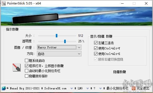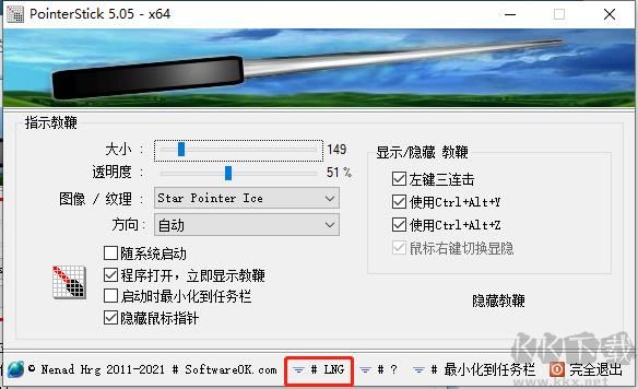 9、提供多種顯示或隱藏指示棒的方法以提升易用性,包括鼠標(biāo)三擊、右鍵點擊系統(tǒng)托盤以及兩個熱鍵(即Ctrl+Alt+Y和Ctrl+Alt+Z)。