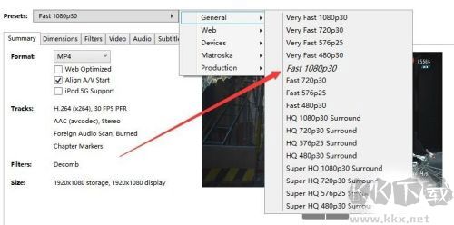 2、我們使用此工具主要是因?yàn)樾枰幚硪舢嫴煌降囊曨l,因此選擇時(shí)盡量選取較高分辨率以減少畫質(zhì)損失。通過presets選項(xiàng)即可選擇。