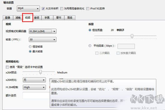 3、接下來進(jìn)入"視頻"功能選項(xiàng),根據(jù)需要的壓縮程度,x264預(yù)設(shè)向左調(diào)整體積越小,向右調(diào)整則質(zhì)量越高。只需調(diào)節(jié)此選項(xiàng)即可實(shí)現(xiàn)視頻壓縮;后面還有音頻、字幕、章節(jié)選擇等功能,若僅需壓縮視頻這些均可忽略。最后點(diǎn)擊上方的"開始"選項(xiàng)即可啟動(dòng)壓縮過程,如下示意圖所示: