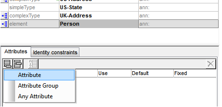 2、單擊附加圖標(biāo) ic_tbl_append_row, 在 "屬性/標(biāo)識約束" 選項卡組的左上部分 (在 "架構(gòu)概述" 窗口的下部) 中, 選擇屬性項。