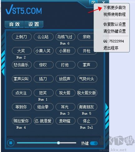 VST5音效助手是一款功能齊全的音效添加工具,非常適合主播在直播時中使用。軟件內有許多音效,包括小黃人笑、開槍、掌聲等,還有一些網(wǎng)絡中比較有趣的音頻,幫助進行網(wǎng)絡直播、主持喊麥等,提供各種各樣的氣氛渲染音效。軟件能夠快速地為自己的直播添加有趣的音效,支持用快捷鍵播放,是十分實用的直播輔助工具,讓觀眾更加喜歡主播的直播內容,吸引觀眾目光。簡潔的使用界面,最大化壓縮主程序的體積,打開速度更快。添加、刪除、更換音效更方便,使用“還原配置”功能全自動刷新音效,可以設置快捷鍵,隱藏到后臺使用,非常方便。