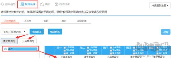 如果需要設(shè)置早晚自習(xí),可以將早晚自習(xí)在基礎(chǔ)信息里和正課進(jìn)行區(qū)分,并為早晚自習(xí)設(shè)置不排課時(shí)間(用來限制早晚自習(xí)的排課節(jié)次)。