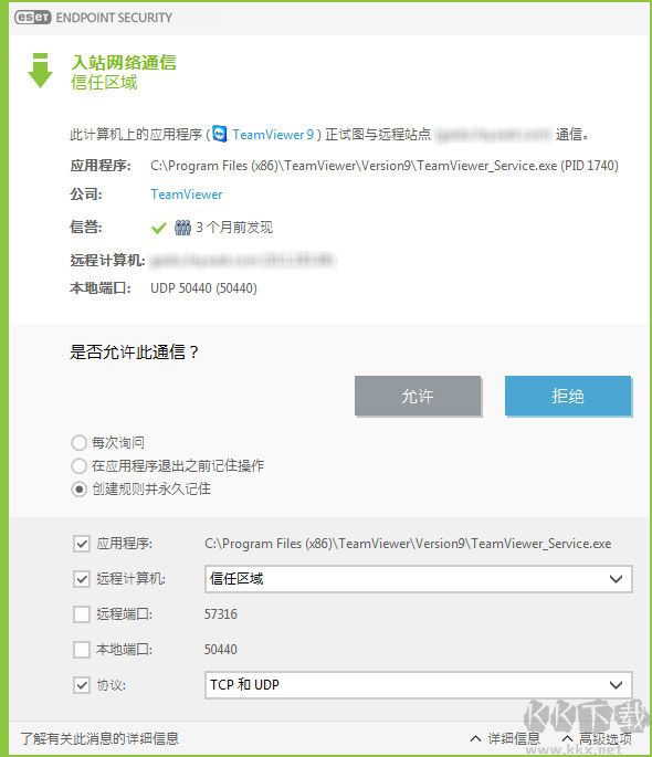 如果以交互模式檢測到新連接,并且沒有匹配的規(guī)則,將提示您允許或拒絕該連接。如果希望每次應用程序嘗試建立連接時 ESET Endpoint Security 均執(zhí)行相同操作,請選中記住操作(創(chuàng)建規(guī)則) 復選框。