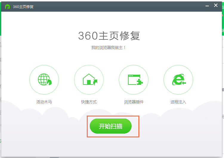如圖,點(diǎn)擊【開始掃描】,360就會開始掃描系統(tǒng)中的快捷方式、瀏覽器插件、可能影響主頁鎖定的軟件等等,然后按照提示重啟電腦即可。