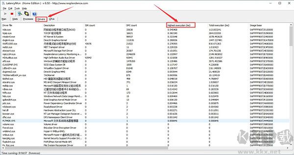 2、通過按最大執(zhí)行耗時(shí)列排序,可快速識別引發(fā)延遲問題的全部驅(qū)動程序。