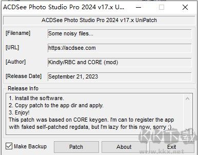 4、將補(bǔ)丁文件復(fù)制到ACDSee Photo Studio Pro 2024的根目錄下運(yùn)行,點擊【patch】按鈕