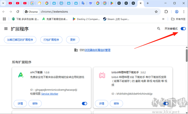 3、開(kāi)啟右上角“開(kāi)發(fā)者模式”(必須開(kāi)啟,否則無(wú)法安裝);