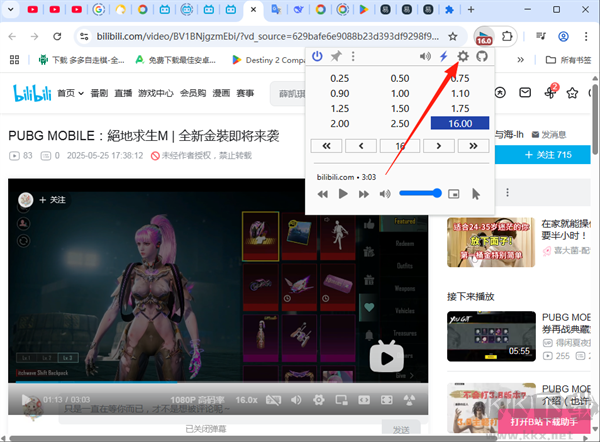 點(diǎn)擊插件圖標(biāo),即可看到0.25倍至16倍的速度選單,點(diǎn)擊所需速率,當(dāng)前視頻的播放速度就會(huì)立即切換。