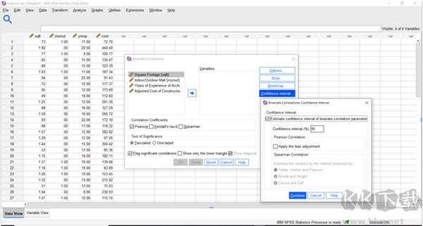 SPSS Statistics 27中的功能在“置信區(qū)間“子對話框的”雙變量相關(guān)“對話框菜單中找到。用戶將能夠設(shè)置置信區(qū)間參數(shù)進(jìn)行應(yīng)用偏差調(diào)整之間相關(guān)系數(shù)。