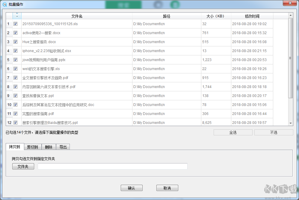 檢索完成后,若有結(jié)果,點(diǎn)擊“批量處理”可對(duì)全部符合條件的文件進(jìn)行操作。彈出窗口中用戶可將文件復(fù)制、剪切至指定目錄,也可執(zhí)行刪除或?qū)С鼋Y(jié)果信息。