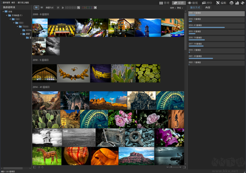 媒體模式提供基于數(shù)據(jù)庫(kù)的數(shù)字資產(chǎn)管理方式。在管理模式中瀏覽并已被編入數(shù)據(jù)庫(kù)的文件夾將顯示于媒體模式下,呈現(xiàn)清晰有序的照片與視頻視圖。