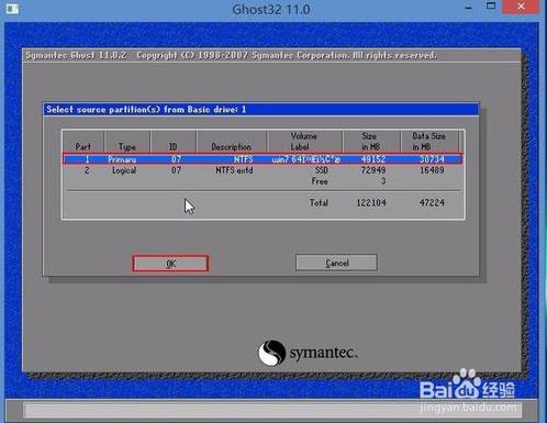 5、再接下來(lái)就是選擇分區(qū),也就是你要備份的本地磁盤(pán),下面只有兩個(gè)分區(qū),默認(rèn)第一選項(xiàng)為主分區(qū),即C盤(pán),也就是你的系統(tǒng)所在分區(qū),選擇后使用TAB鍵切換到OK,回車;