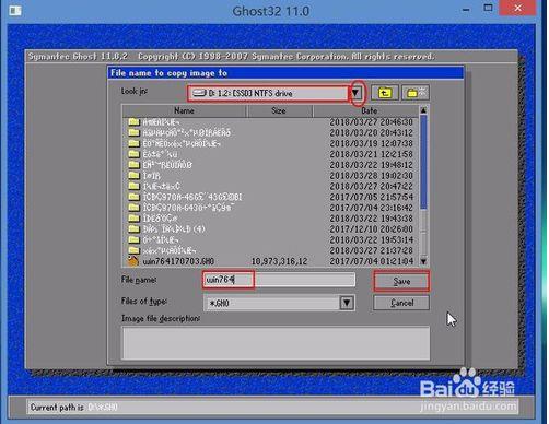 6、接來(lái)就出現(xiàn)文件瀏覽界面,也就是我們選擇備份要保存的位置,還有備份文件名了。備份不能選系統(tǒng)所在分區(qū)。然后在“File name”一欄輸入文件名(如Win764),點(diǎn)擊 “Save”,保存;