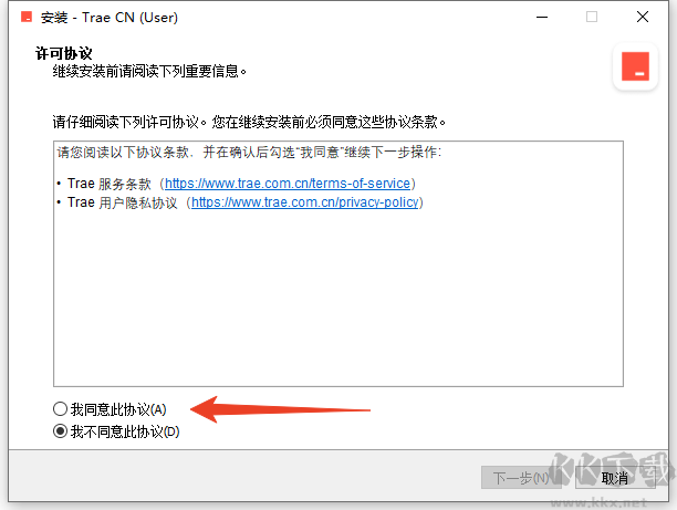 1、下載后運行“Trae CN-Setup-x64.exe”,勾選同意協(xié)議后點擊下一步;