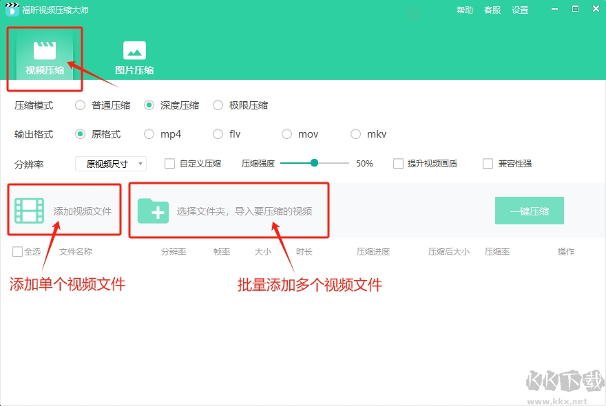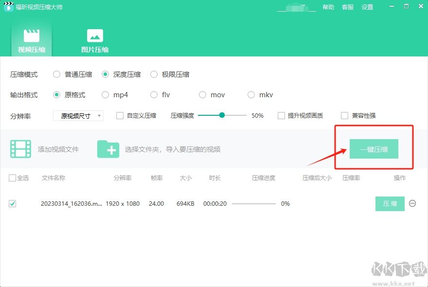 步驟二:在【視頻壓縮】選項(xiàng)下,選擇壓縮模式(普通壓縮/深度壓縮/極限壓縮)以及輸出視頻的格式和分辨率,點(diǎn)擊【添加視頻文件】上傳單個(gè)視頻文件,或點(diǎn)擊【選擇文件夾,導(dǎo)入要壓縮的視頻】來(lái)批量添加多個(gè)視頻文件;