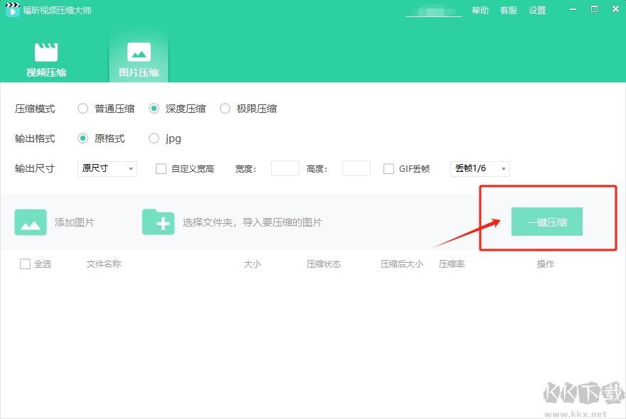 步驟二:在【圖片壓縮】選項(xiàng)下,選擇壓縮模式(普通壓縮/深度壓縮/極限壓縮)以及輸出圖片的格式和尺寸,點(diǎn)擊【添加圖片】上傳單張圖片,或是點(diǎn)擊【選擇文件夾,導(dǎo)入要壓縮的圖片】批量添加多張圖片;