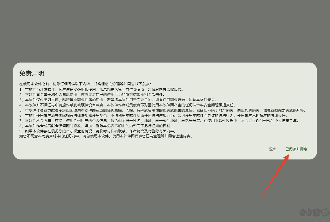 1、用戶首次啟動應用可能見到免責聲明圖示,點擊同意即可。