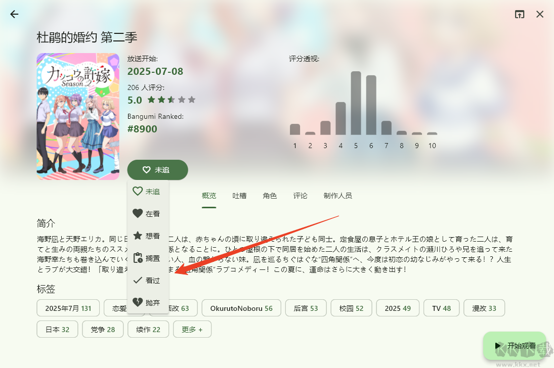 5、收藏功能提供多種選擇,如“在看”、“想看”,便于用戶歸類和收藏。