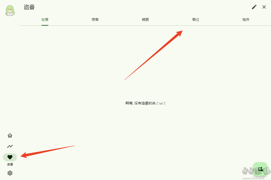 6、查看收藏內(nèi)容的位置:點擊左側(cè)追番按鈕進入收藏頁,點擊上方標簽可切換收藏分類。
