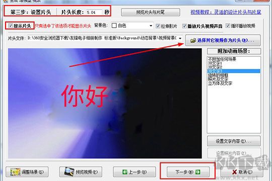 2、點(diǎn)擊下一步,在左上角會(huì)出現(xiàn)片頭提示出現(xiàn),勾選顯示片頭,在右方的附加動(dòng)畫場(chǎng)景選擇合適的片頭動(dòng)畫,選項(xiàng)導(dǎo)入片頭文件,如下圖所示: