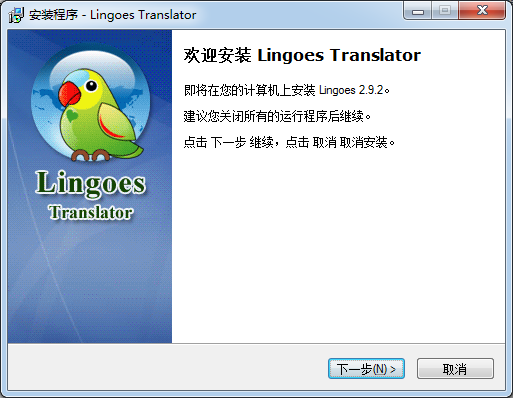 2.歡迎安裝Lingoes Translator即將在您的計(jì)算機(jī)上安裝Lingoes 2.9.2。建議您關(guān)閉所有的運(yùn)行程序后繼續(xù)。點(diǎn)擊下一步維續(xù)。點(diǎn)擊取消取消安裝。