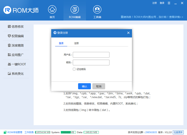 ROM大師是一款簡(jiǎn)單易用又專(zhuān)業(yè)的rom文件解包打包工具,支持所有機(jī)型的ROM編輯,支持*.img、*.cpb、*.app、*.pac、*.bin、*.binx、*.ext4、*.qsb、*.dat、*.tar、".tgz、*.rar、*.new、*.dat、*.tar、*.md5、7z、zip等格式的解包打包,支持系統(tǒng)精簡(jiǎn)、信息修改、權(quán)限編輯、內(nèi)置ROOT、系統(tǒng)美化,可以任意刪除不需要的內(nèi)置軟件,是一款專(zhuān)業(yè)強(qiáng)大的ROM定制工具!