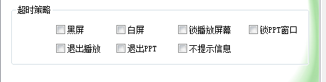 超時(shí)策略,可以選擇顯示的時(shí)鐘、提示鈴聲、密碼解鎖、黑屏、白屏、鎖播放屏幕、鎖PPT窗口、推出播放、推出PPT、不提示信息