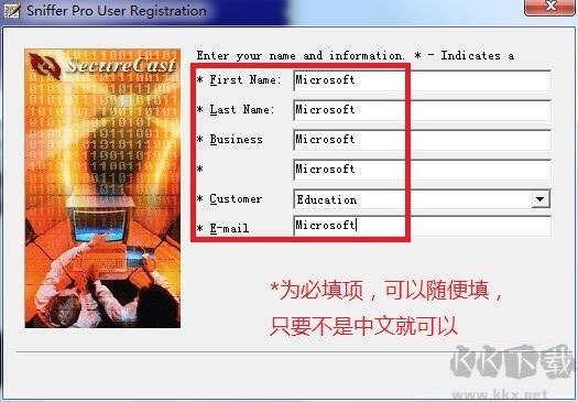 4、安裝完成后會(huì)出現(xiàn)Sniffer用戶注冊(cè)信息框,信息框內(nèi)不能輸入中文