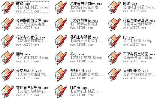sketchup材質(zhì)庫(su材質(zhì)庫)是方便經(jīng)常使用sketchup做圖的朋友使用,包含了面磚、木材、石子與泥土路面、天空與水面、透明貼圖、瓦與彩鋼板、文化石與剁斧石、自然石等生活中常見的材質(zhì),有興趣的朋友不妨下載試試。