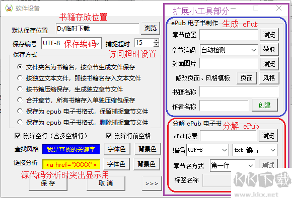 附帶小工具:ePub 電子書制作、分解工具,支持多以章節(jié)存放的書籍生成ePub 文件,也可以將 ePub 文件分解為多章節(jié)的文本文件。