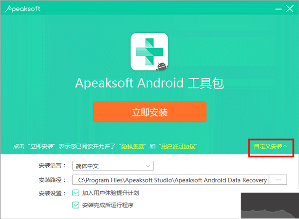 安裝向?qū)J(rèn)設(shè)置的軟件默認(rèn)安裝路徑為C:\Program Files (x86)\Apeaksoft Studio\Android Data Recovery