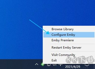 2、右鍵點(diǎn)擊任務(wù)欄中出現(xiàn)的綠色小圖標(biāo),選擇 Configure Emby 選項(xiàng),若出現(xiàn) “Emby Server is loading.” 的提示,就稍等片刻,之后刷新該頁(yè)面。