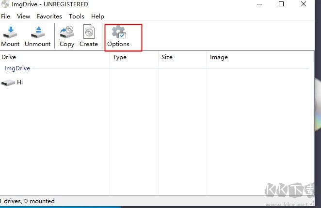 1、打開ImgDrive官方版,進入軟件主界面,選擇【Options】設(shè)置選項;