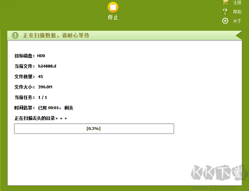 選定掃描模式及對應(yīng)盤符或磁盤后,點擊“下一步”按鈕即可開始掃描。掃描過程中可實時查看進度、剩余時間及已掃描出的文件數(shù)量等信息。